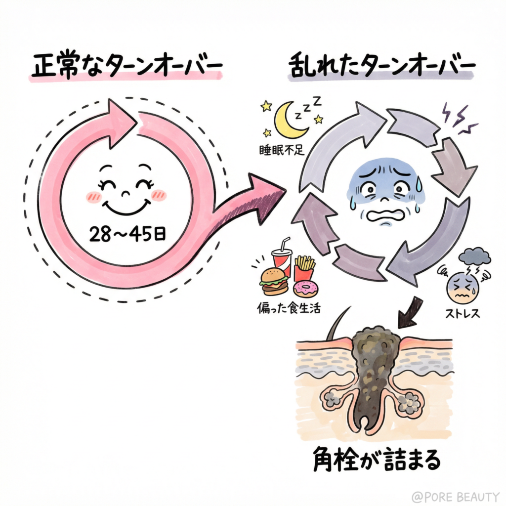 図①:ターンオーバーの乱れが毛穴詰まりを引き起こすサイクル