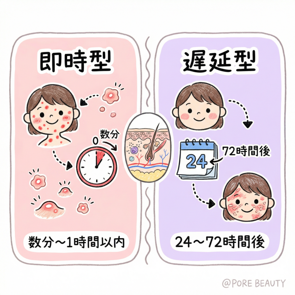 | 即時型(Ⅰ型) | 接触後すぐに反応が出る | かゆみ・赤み・じんましん | 数分〜1時間以内 |