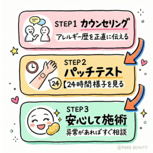 アレルギーのリスクをゼロにすることはできませんが、 正しく理解して適切に準備することで、安全に施術を受けることは十分可能です。