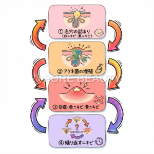| ③ 炎症の発生 | 赤く腫れた赤ニキビ・膿んだ黄ニキビへ進行 | 免疫反応による炎症 |