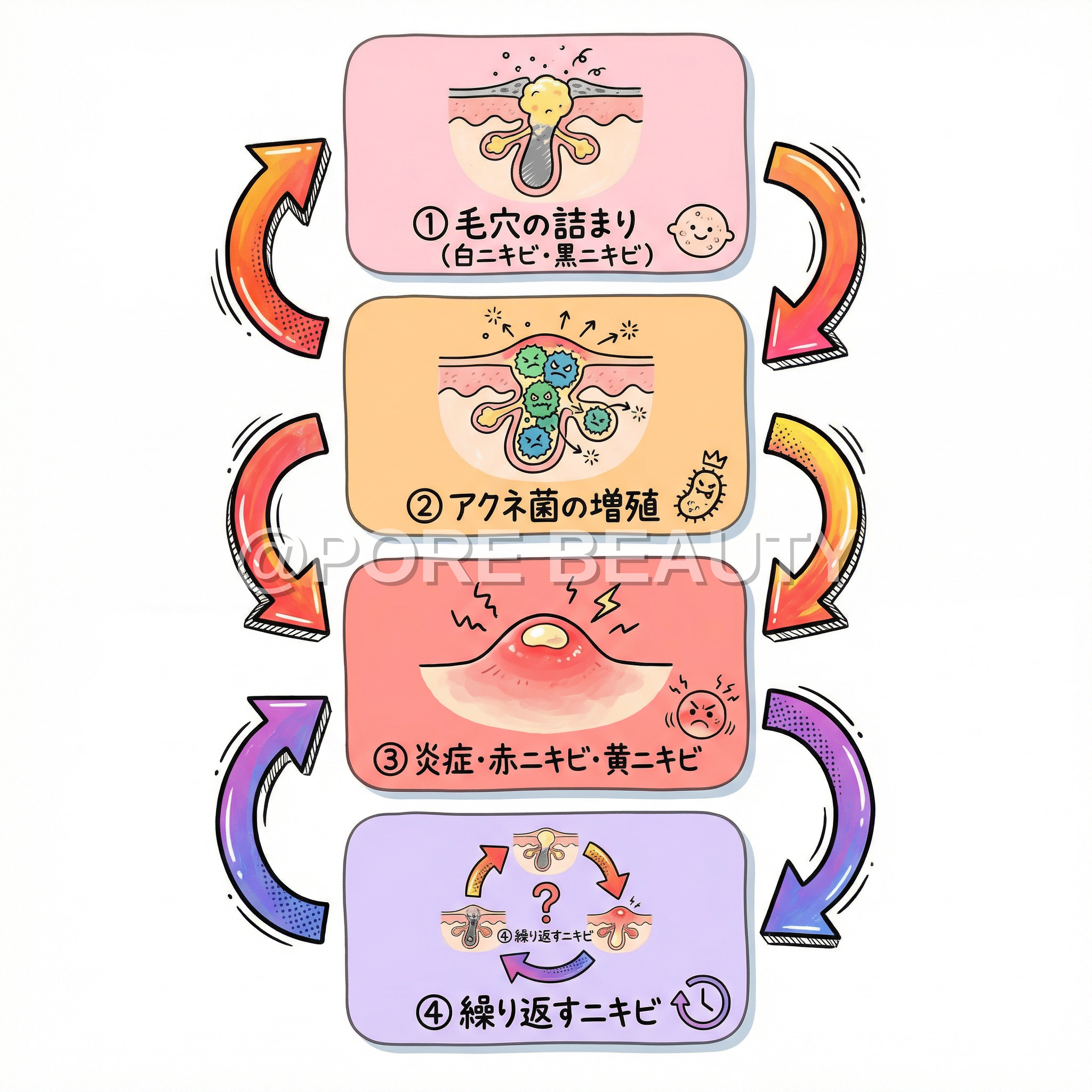 | ④ 繰り返し | 毛穴の詰まりが解消されないまま再発 | 根本的な毛穴ケア不足 |