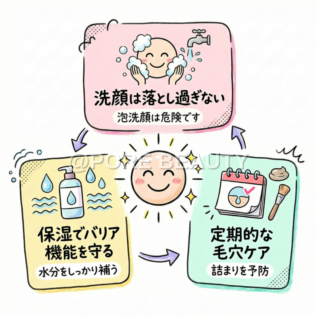 - 洗顔・保湿・定期的な毛穴ケアが、ニキビ予防の基本