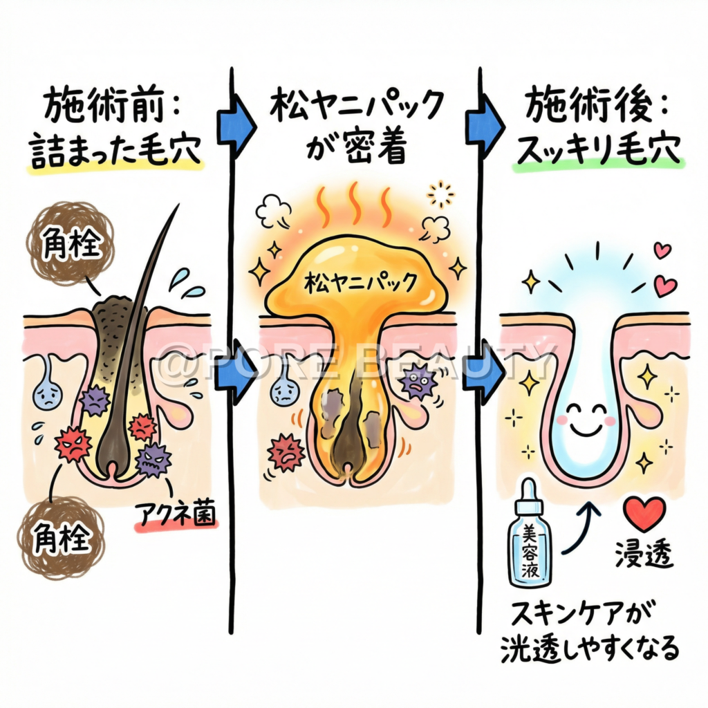 - 松ヤニパックは、毛穴の詰まりを根本から取り除くことでニキビが繰り返しにくい環境を整える