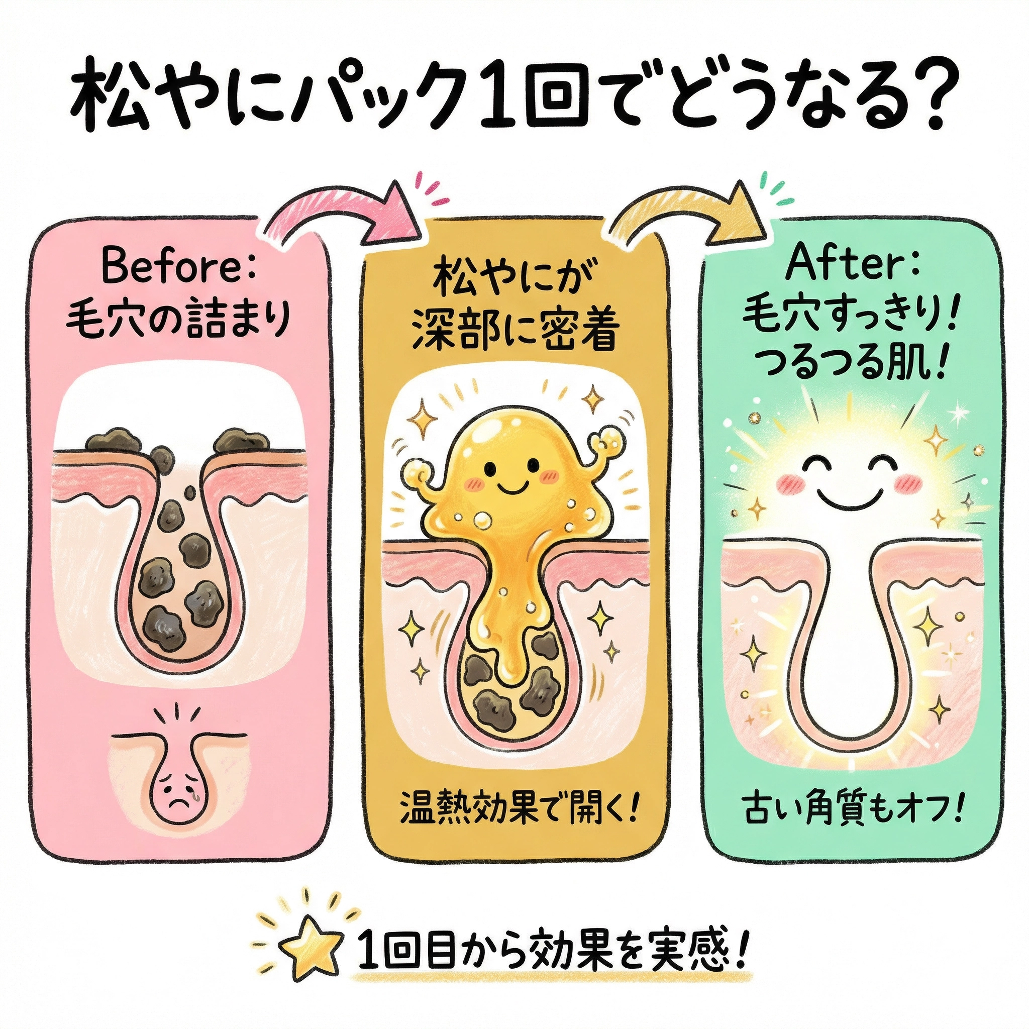 これは、温めた松ヤニが毛穴の奥に密着し、酸化した皮脂や古い角質が固まった角栓を、剥がすときにまとめて取り除くからです。毛穴の内側から汚れを引き出すアプローチは、洗顔や市販のパックとは根本的に異なります。