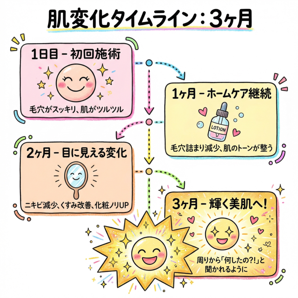 施術後の肌を触ると、毛穴の詰まりが取れてつるんとした感触に変わっていることに気づくはずです。くすみが和らいで肌のトーンが明るく見えたり、スキンケアがすっと浸透する感覚が出てきたりと、1回でも目に見える変化を感じる方がほとんどです。