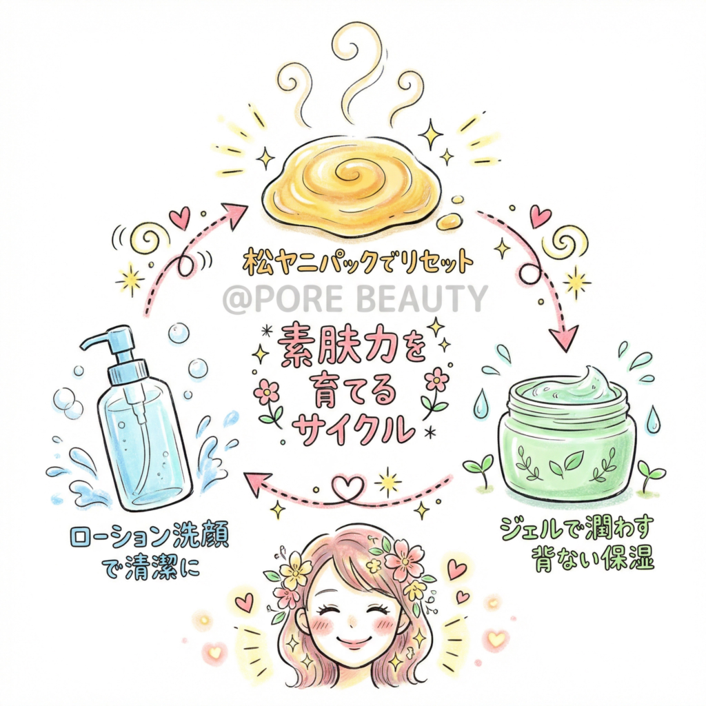 松ヤニパックで不要なものをリセットし、オイルフリーの保湿で肌を甘やかさずに育てる。