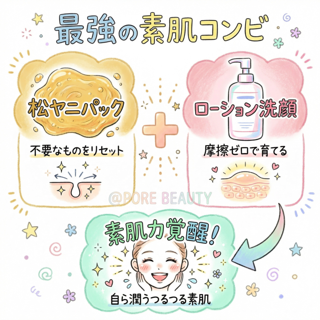 松ヤニパックで「リセット」し、ローション洗顔で「育てる」。