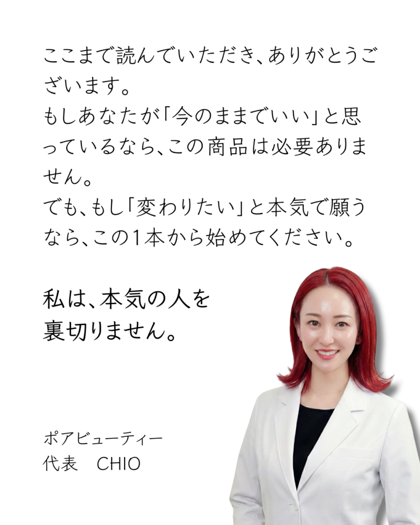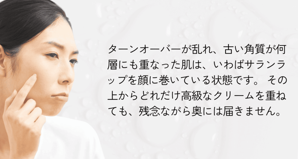 くすみもシワも年齢のせいにして諦めていました。でも、それは単に『古い皮』を溜め込んでいただけだったんですね。 余計なものを脱ぎ捨てたら、内側からパンッ!と張りのある艶が出てきて、『来月の肌はもっと綺麗かも』なんて、未来にワクワクできるなんて思いもしませんでした。