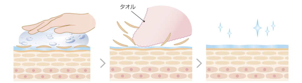 浮き上がった汚れと古い角質を、お湯で絞った専用タオルで優しく拭き取ります。 何層にも重なった古い角質を一枚ずつ取り除いていく作業です。 拭き取ったら、またローションを乗せる。これを1日10回繰り返します。