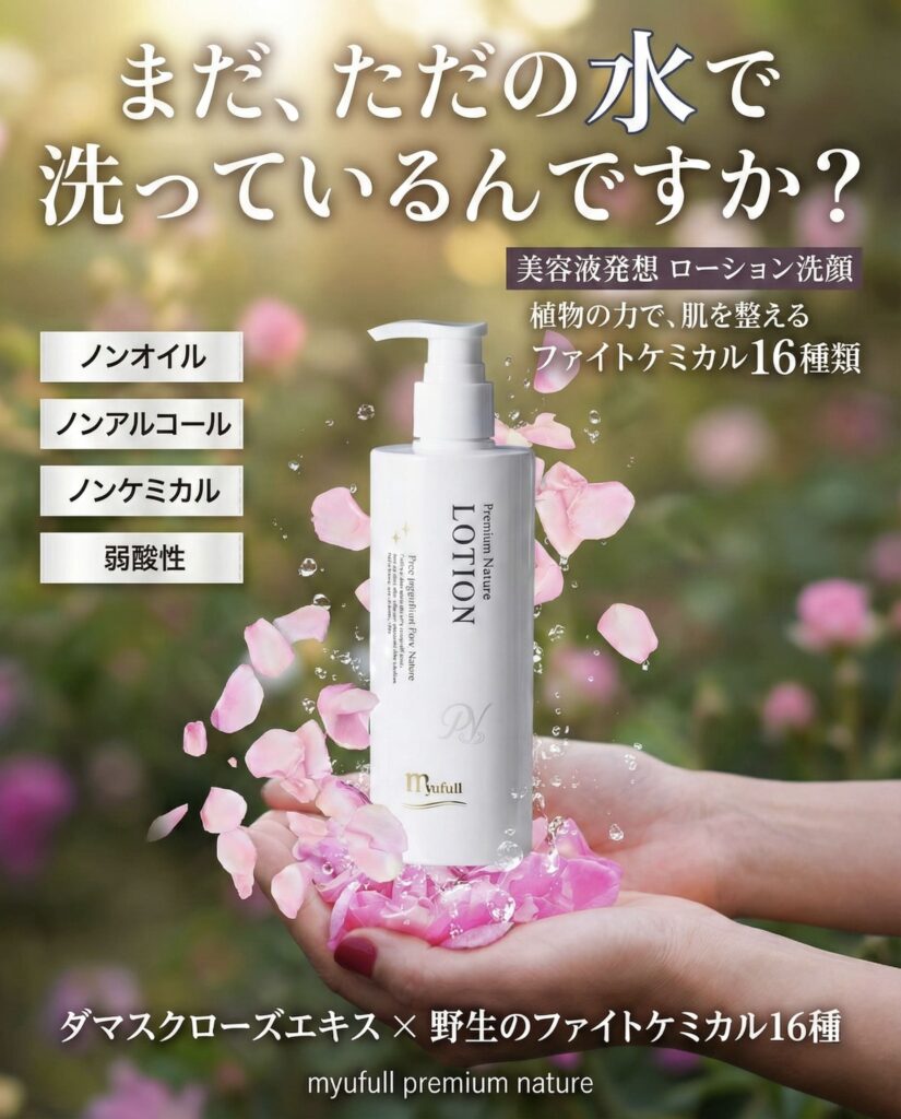 プレミアムナチュレローションは、成分の55%をダマスクローズエキスに置き換えました。16種類の美容成分を浸透させながら古い角質だけを浮かせる。これは洗顔という名の、肌育トリートメントです。